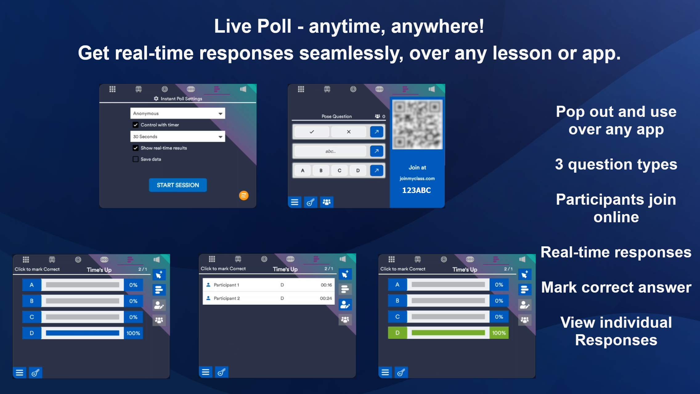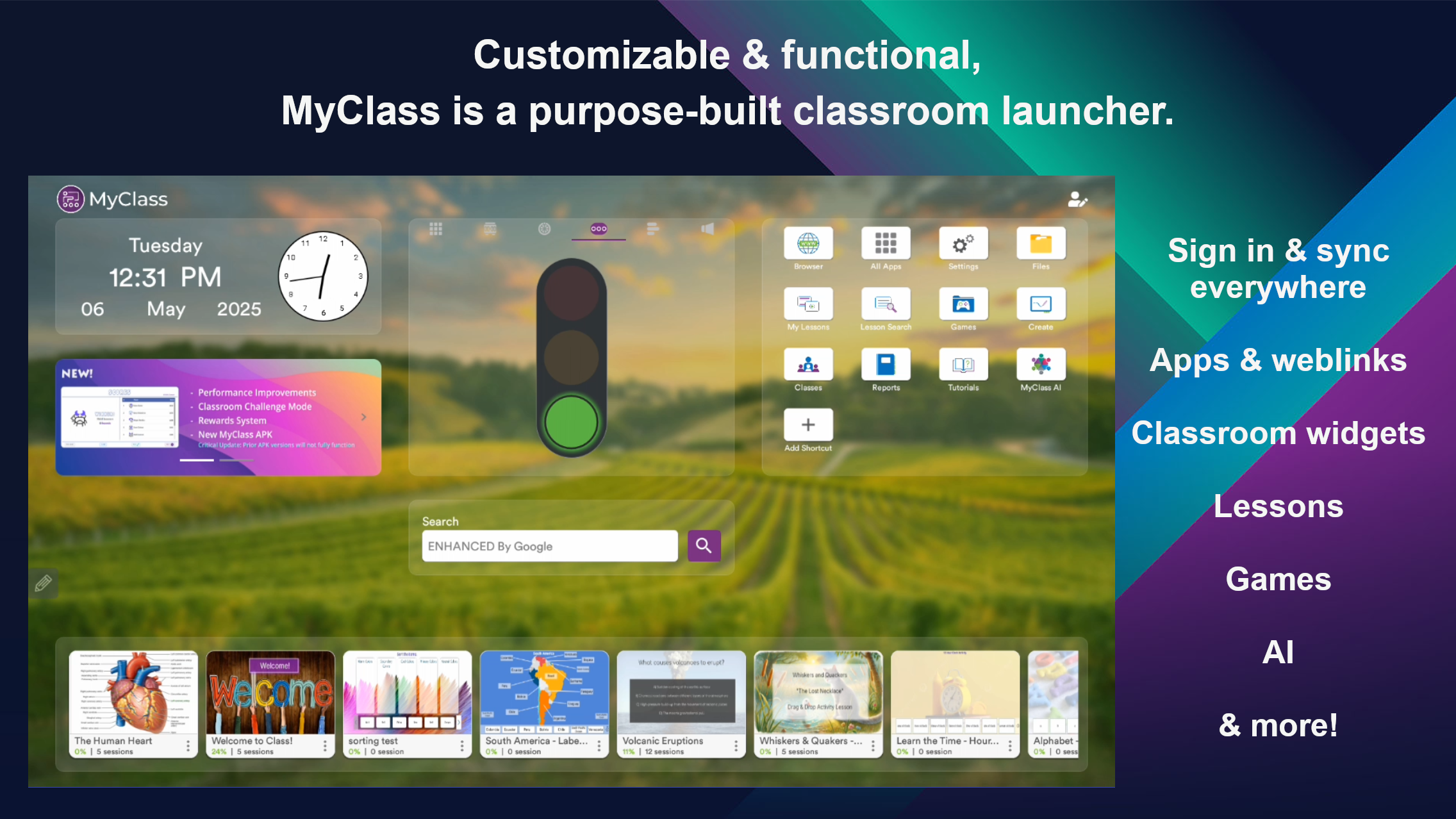 The MyClass Launcher replaces the default Android experience with a clean, focused dashboard designed specifically for the classroom. Launch directly into existing lessons, access your favorite apps or websites with one tap, customize your setup with backgrounds, apps, and access built-in classroom widgets like timers and polls.